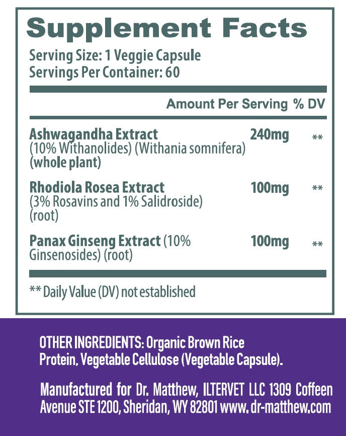 Each batch of Dr. Matthew Shoden Ashwagandha supplement is tested by independent ISO 17025 accredited labs. This ensures that our product is free of heavy metals, and free of pathogenic microorganisms. The tests also confirm that our product contains the amount of Ashwagandha that we claim on the label. What's more they prove that our product contains Rhodiola and Ginseng as well.
